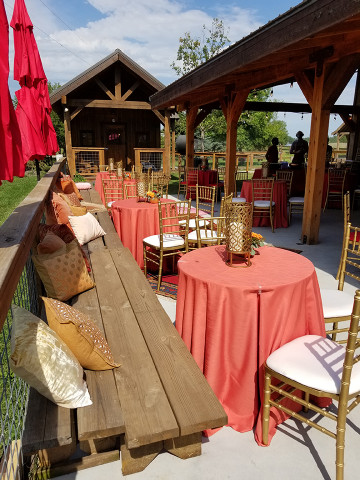 We rent 30" round tables (bistro or cafe tables). These tables break down into a metal base, chrome pole and lacquered wood top for easy transport. These tables seat 4 comfortably. A 90" round tablecloth will fit this table to the floor.