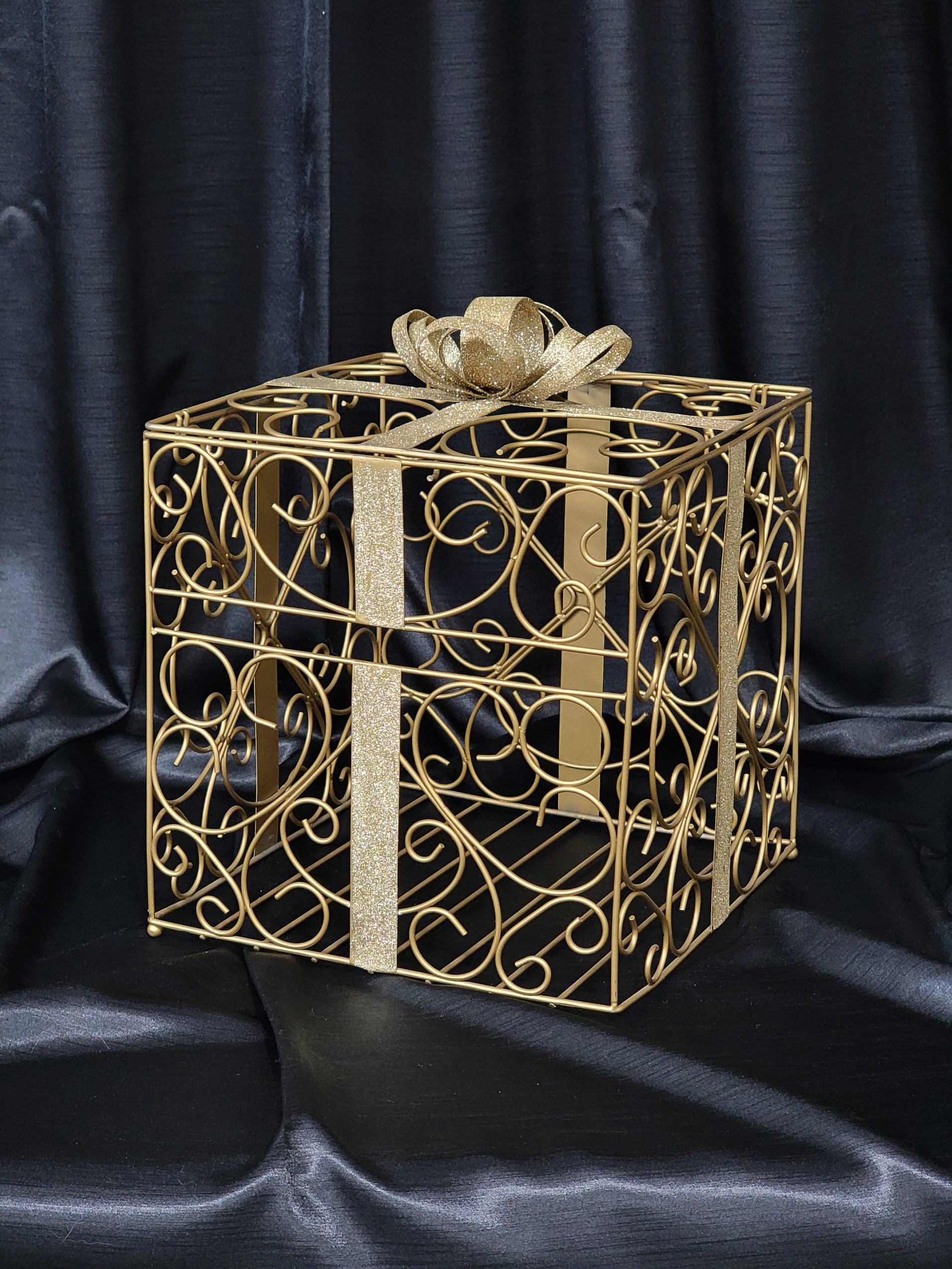 Renting a card box is so easy! This gold and glitter metal card box measures 10" Wide x 10" Tall x 10" Deep. The front has a slit for the cards and the top removes to empty. Keep those cards safe!